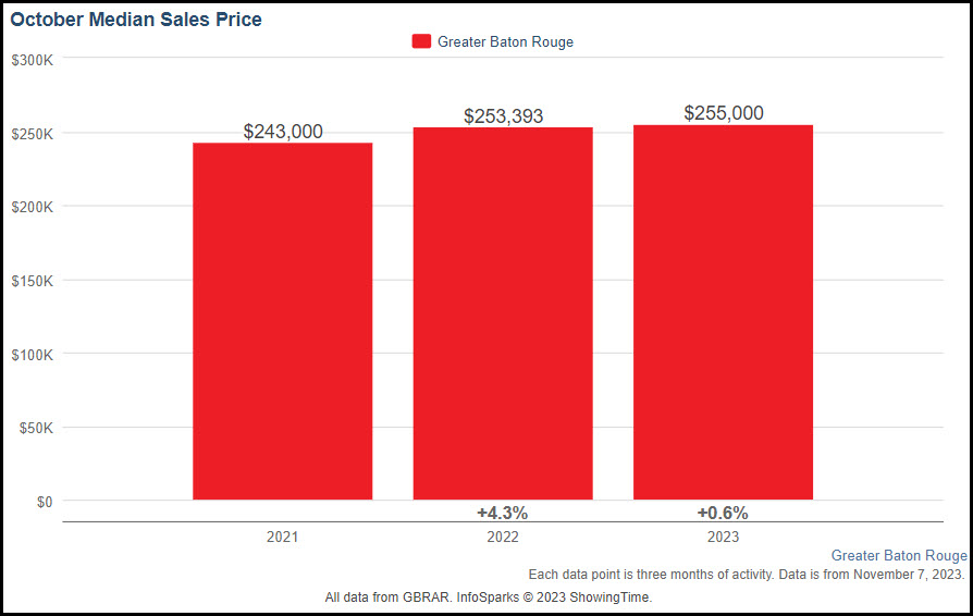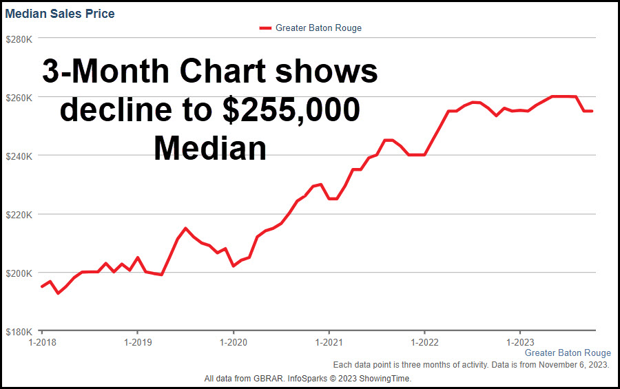 Below, the median Greater Baton Rouge home sales price is still up since 2021 from $243,000 to $255,000, up from 2022 $253,393 to $255,000.