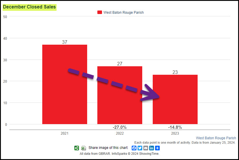 Closed Sales in December 2023 declined from 37 in 2021 to 27 in 2022 (-27%) to 23 in 2023 (-14.8%).