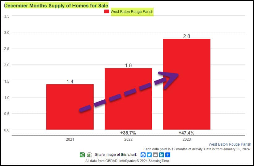 Months Supply of Homes For Sale in December 2023 increased from 1.9 in 2022 to 2.8 in 2023 (+47.4%).