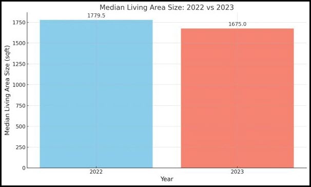 - Median Living Area Size: The median living area size decreased from 1779.5 sqft in 2022 to 1675 sqft in 2023.