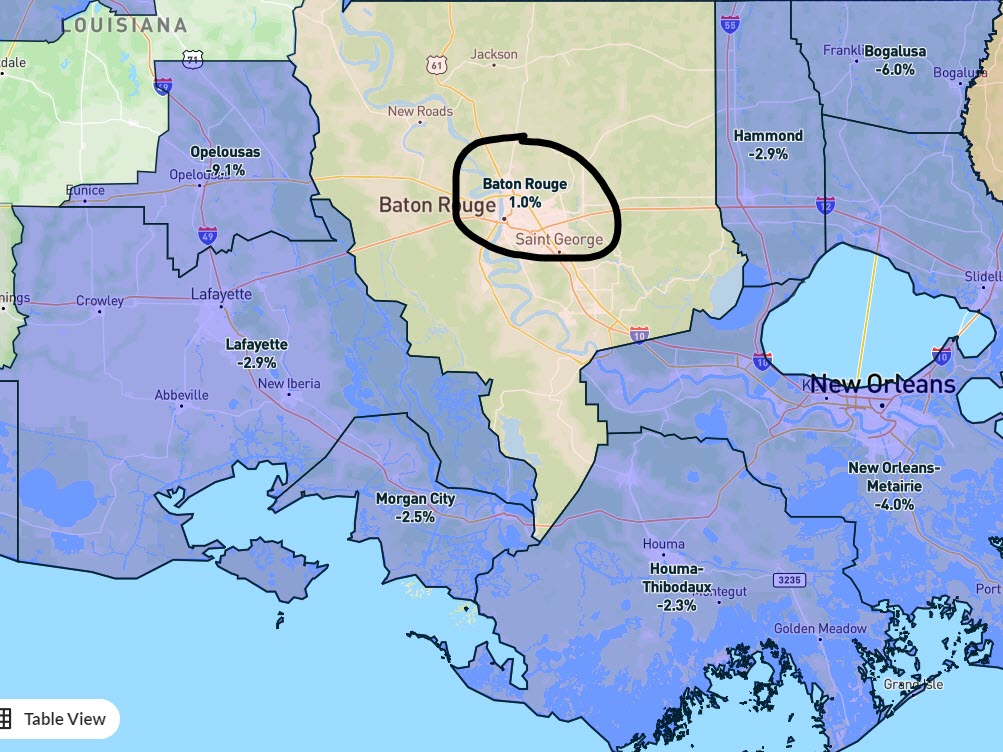 Greater Baton Rouge Home Prices Still Positive Year-over-Year, surrounded by some declining markets in purple…