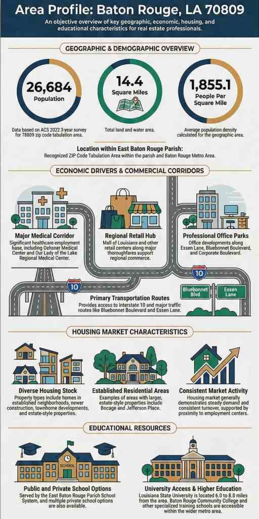 Baton Rouge, Louisiana 70809 is a large area within East Baton Rouge Parish that offers access to both residential and commercial districts. The neighborhood includes established subdivisions, retail corridors, medical facilities, and office parks. It provides access to Interstate 10, allowing for direct connections across the Baton Rouge region. The area also offers access to Bluebonnet Boulevard and Essen Lane, both of which serve as major traffic routes that connect homes, schools, and businesses. This combination of residential neighborhoods alongside healthcare and commercial facilities makes 70809 a diverse and active part of Baton Rouge.
