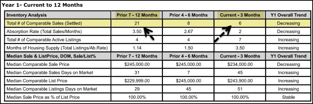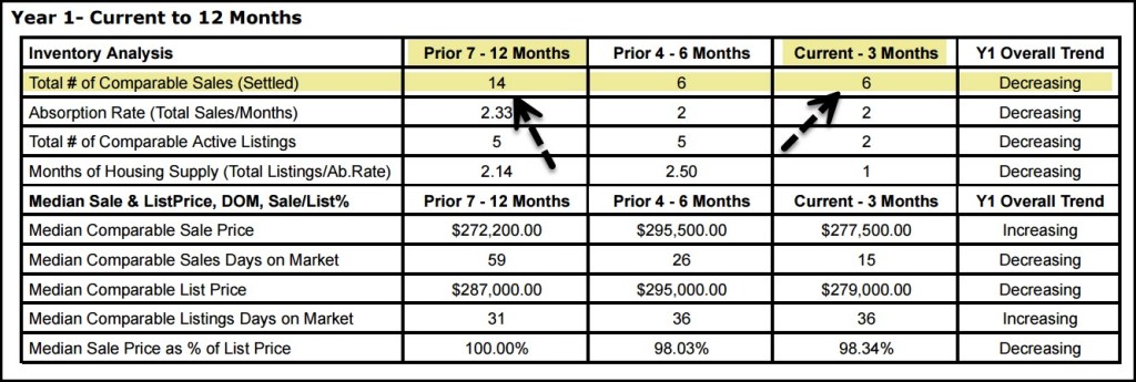 First example shows sales DECLINING from 21 vs 6 or down 71%. I see this type of tend quite often. The number of sales needed to accurately estimate value, as well as support adjustments for pools, extras, remodeling, etc. is diminishing.